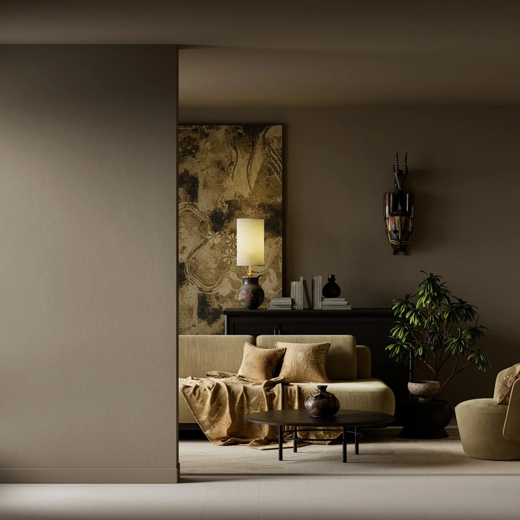 A calm, softly lit living area in the evening